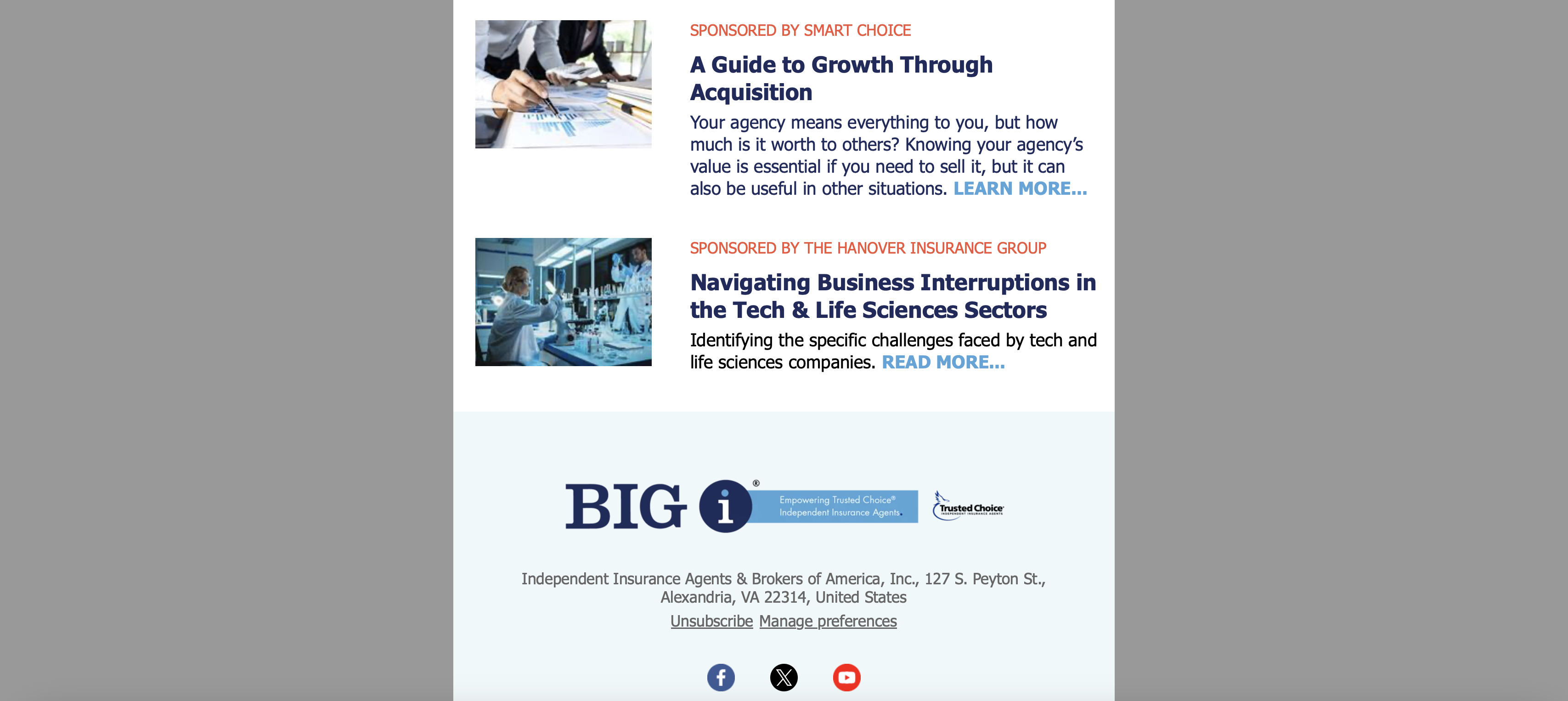 All email footers and e-newsletter headers will include Big “I” logo and in some cases Big “I” and Trusted Choice (company relations, etc.)