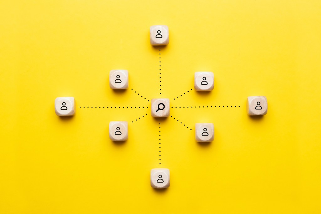 Concept selection and research workers with a magnifying glass on an abstract and employees.