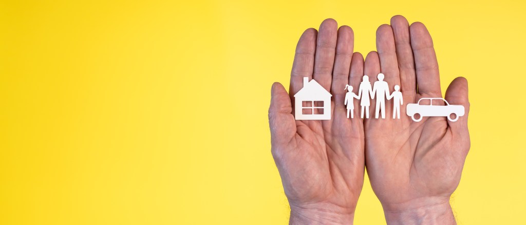 Concept of life, auto and home insurance with paper family, car and house in hands on yellow background