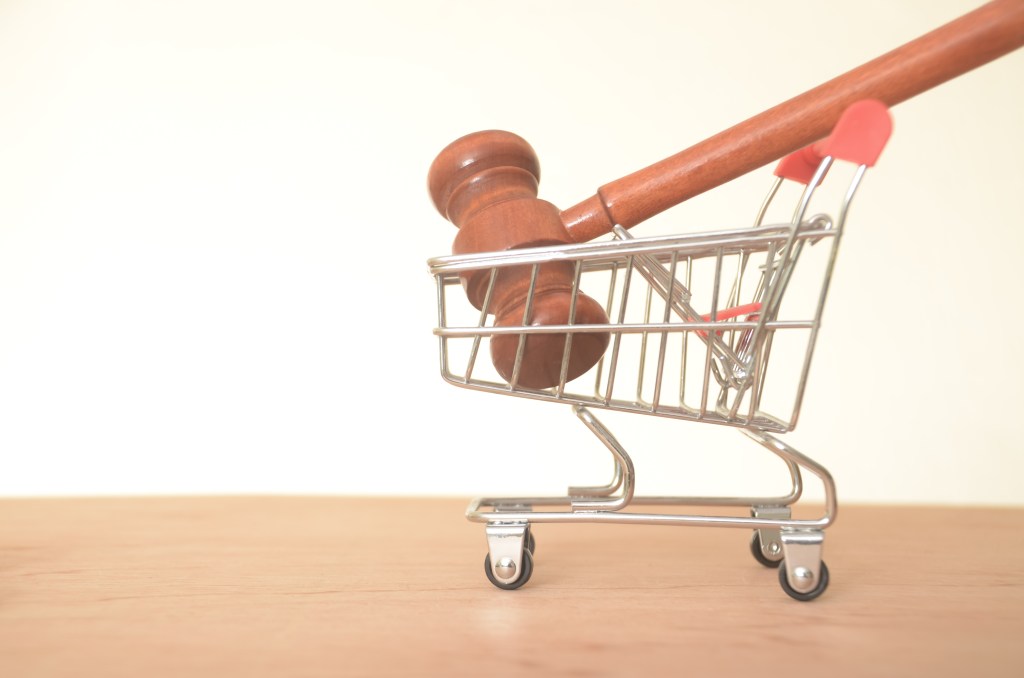 The image of a gavel in a shopping cart suggests the intersection of consumerism and legal matters.
