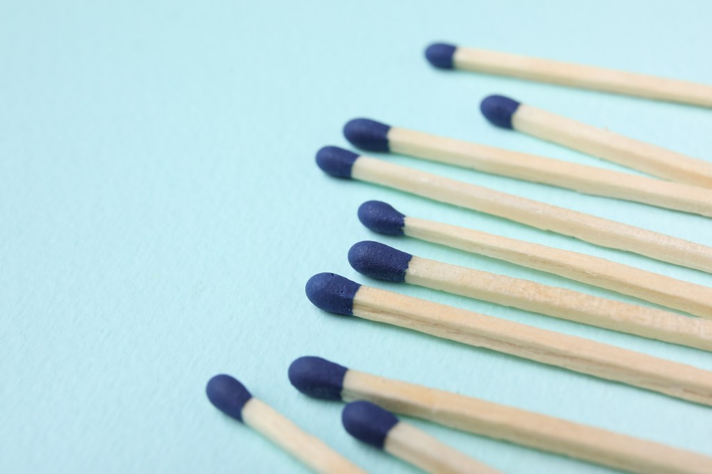 New matchsticks on blue background, closeup