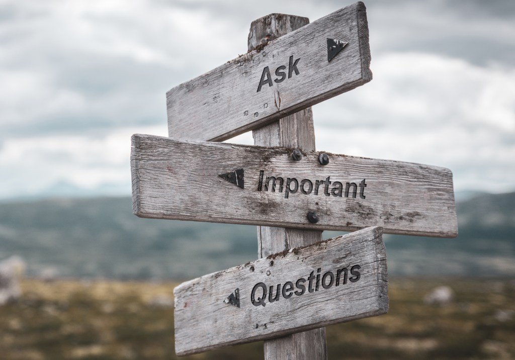 ask important questions text engraved on wooden signpost outdoors in nature. Panorama format.