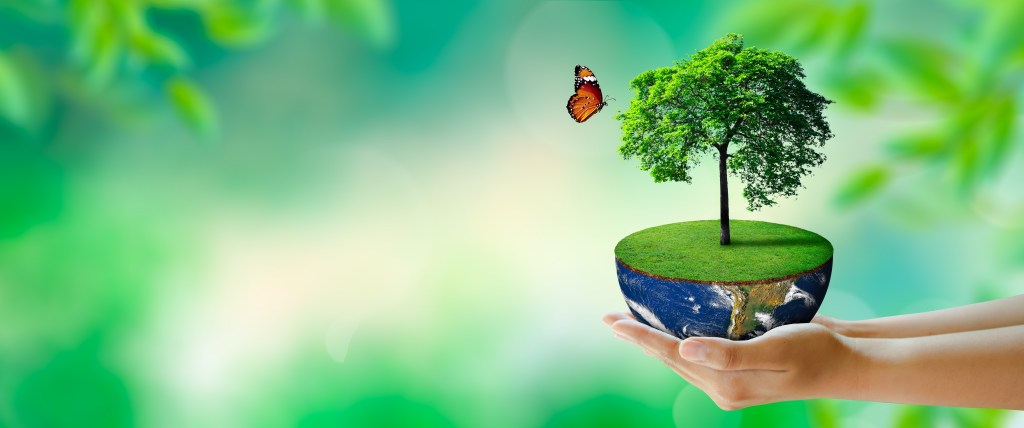Growing tree on half globe in hand with butterfly. Green background with bokeh. World mental health and World earth day. Elements furnished by NASA. Saving environment and World Ecology Concept.