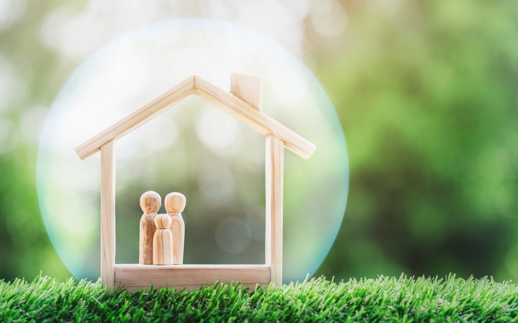 Wooden home with happy family of wooden doll is placed inside on nature bokeh. The saving money for house or real estate owner in the future concept. stay safe at home concept for Coronavirus COVID 19