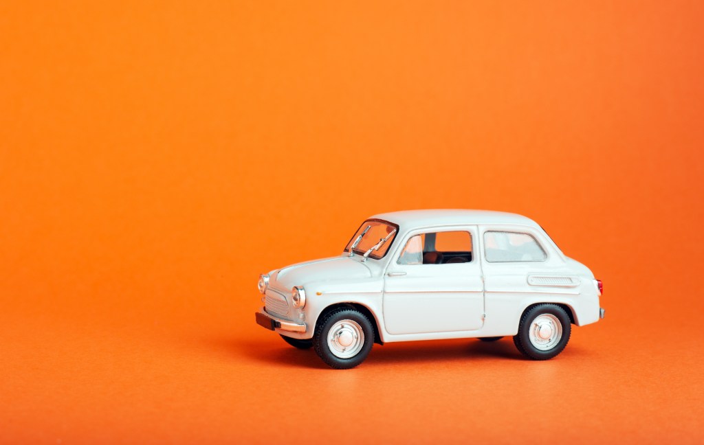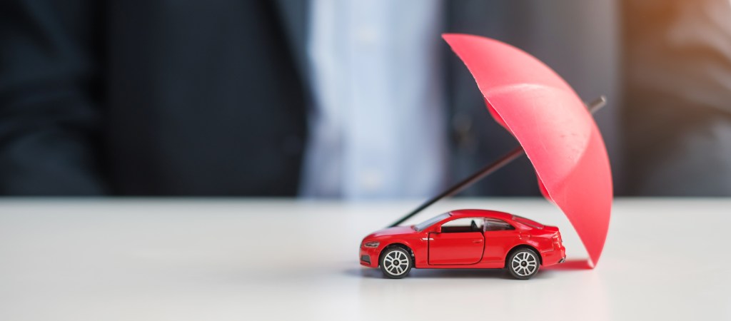 Car insurance concept with car toys on white desk background top view copyspace