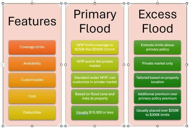 This chart highlights the main features and differences between primary and excess flood insurance.