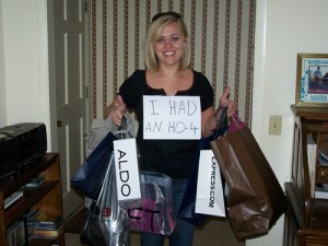 My daughter, 90 days later, finishing up her shopping! (Where did that sign come from?)